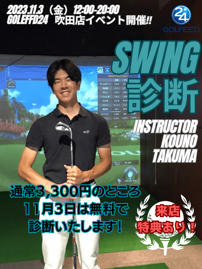 GOLFEED24吹田店にて、11月3日12:00~20:00に当社公認インストラクターによるスイング診断を無料で実施致します!