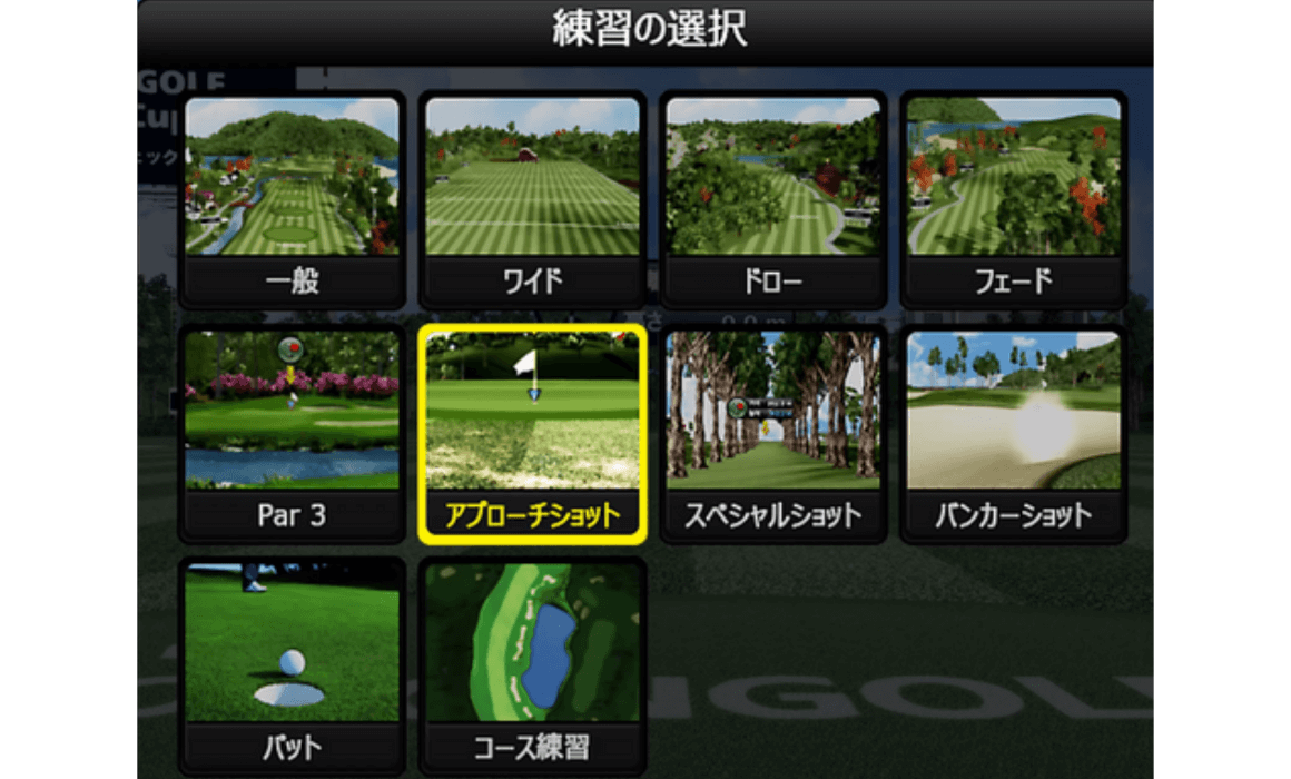 目的別に選べる10種類の本格練習メニューを搭載。ドライバーやショートゲームはもちろん、バンカーやトラブルショットなど、実戦で差がつくシーンも網羅。コース練習モードでは、状況を想定したショットの精度向上にも貢献します。