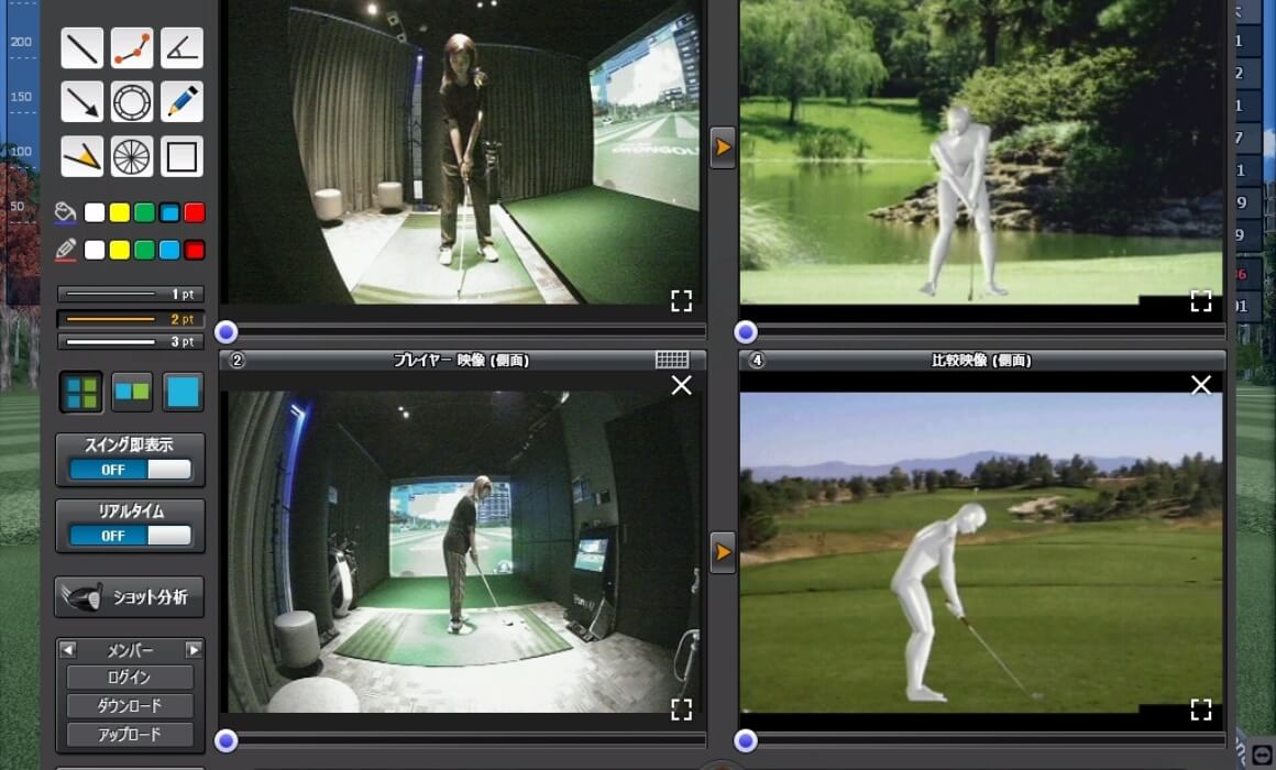 正面・後方の2カメラによるスイング撮影で、フォームを多角的にチェック。修正前後の比較や、理想的なコンピュータグラフィックとの重ね合わせによって、改善ポイントがひと目で可視化され、効率的なスキルアップへつながります。