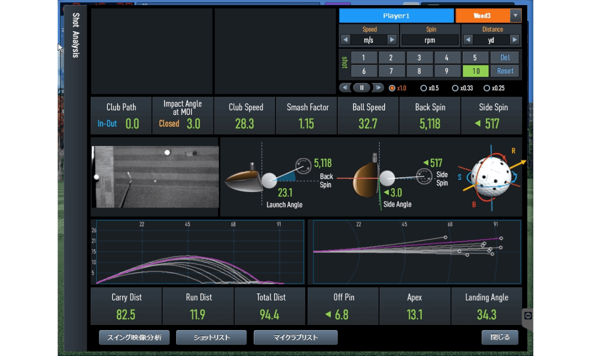 ヘッドスピード、ミート率、打出し角度、バックスピン量など、ショットごとに詳細なデータをリアルタイムで表示。クラブ別のパフォーマンスを数値で把握でき、効率的なクラブ選びやフォーム修正が可能になります。