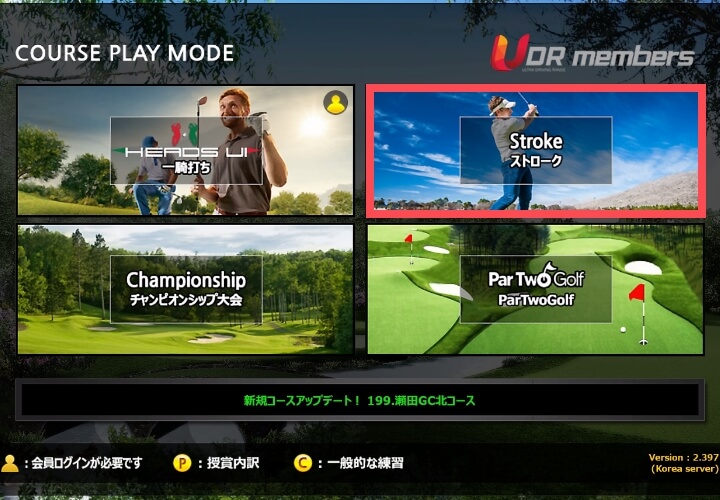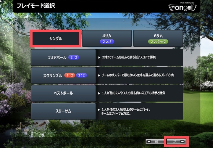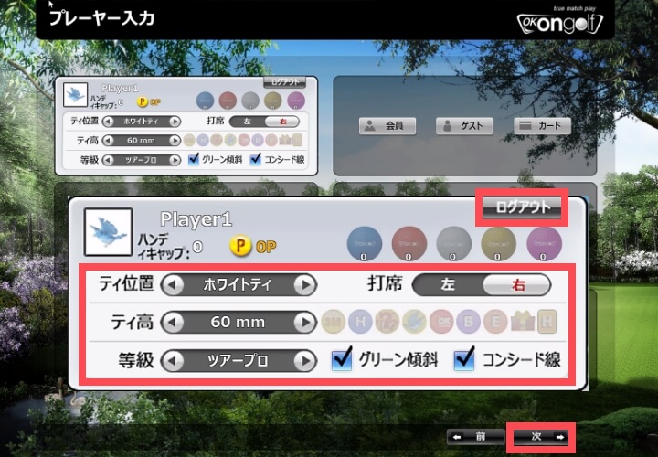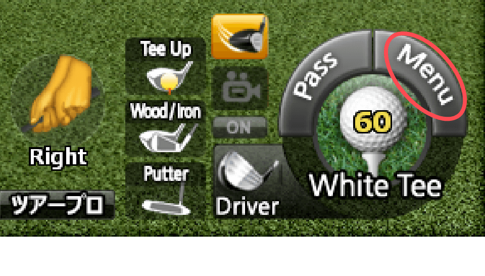 ティーショットのクラブが自動的に「Wood/Iron」に設定されるため、ティーアップして打ちたい場合は「TeeUp」を選択のうえティーの高さを調整してください。