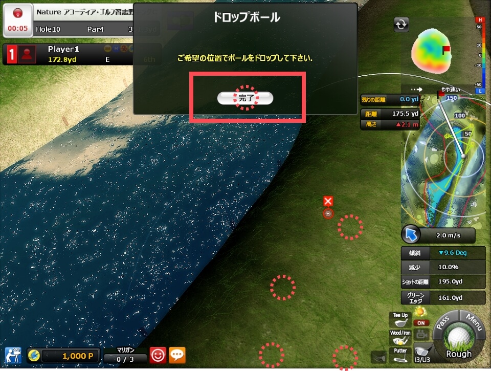 白線の円の中であれば、どこでもドロップ可能!位置が決まるまでタップ可能!位置が確定したら完了をタップ